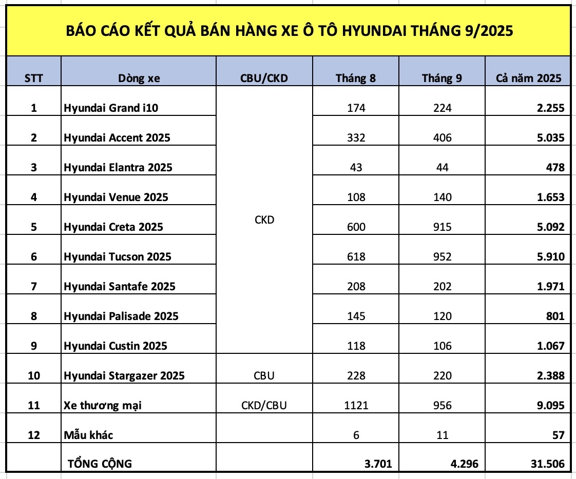 Bảng tổng hợp doanh số các dòng xe Hyundai Tháng 9/2025: